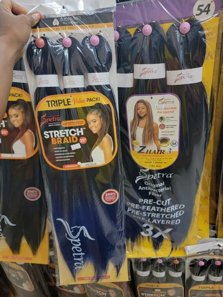 For box braids any hair like the image below will be great. Purchasing three packs of a pre-stretched (3 bundles included) is all you need for box braids.